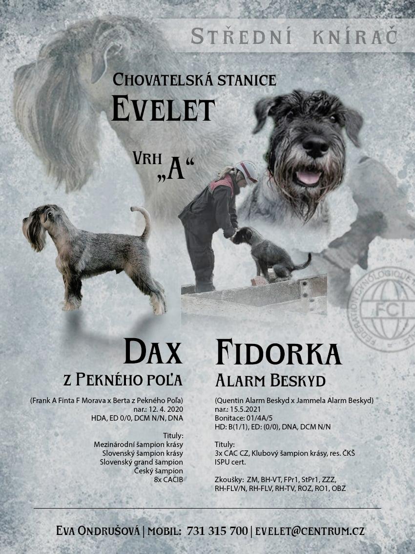 Evelet je chovatelská stanice fungující v rodinném prostředí se zaměřením na aktivní práci se psy. Odchov probíhá v domácím prostředí s dětmi, s důrazem na socializaci a přístupem do venkovního výběhu. Vice na www.daja.websnafno.cz