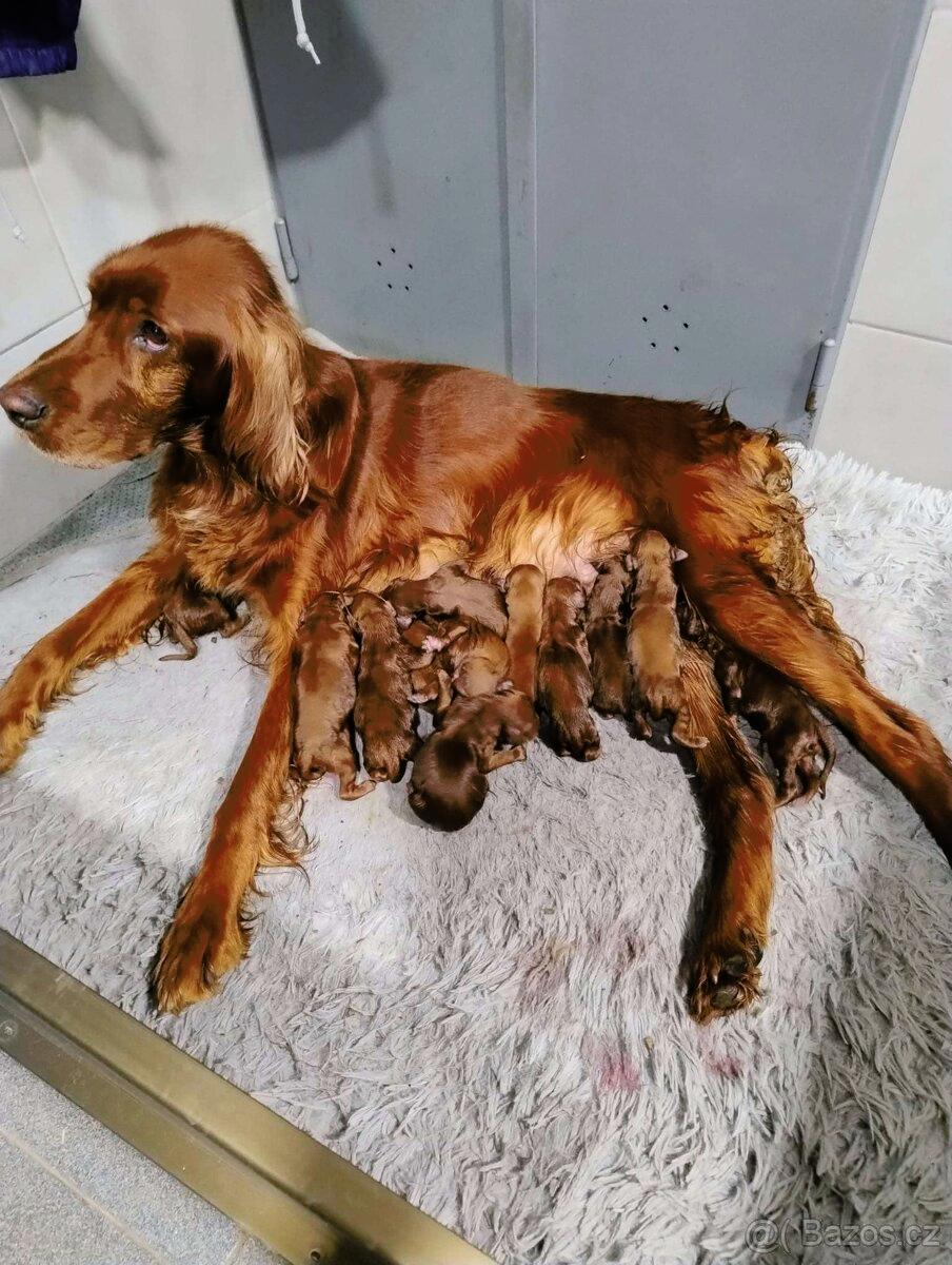MÁME ŠTĚŇÁTKA irských setrů s PP. 3 kluci a 10 holek. Štěňátka se narodila 1. 10. 2025 Naší feně Faia Bohemia Tátrum PZ 1.c. 269/4,klubová výstava VD DKK0/0. Otec Caspien z Hračanské Báně DKK 0/0, výstava V, PZ 1, LZ.KZV,ZVP,KPZ. Rodiče jsou extrémě pracovití a poslušní. K odběru by měla být připravena 1.12.2025. Zájemci volejte na 775570528 , nebo mail bruzamirek@seznam.cz