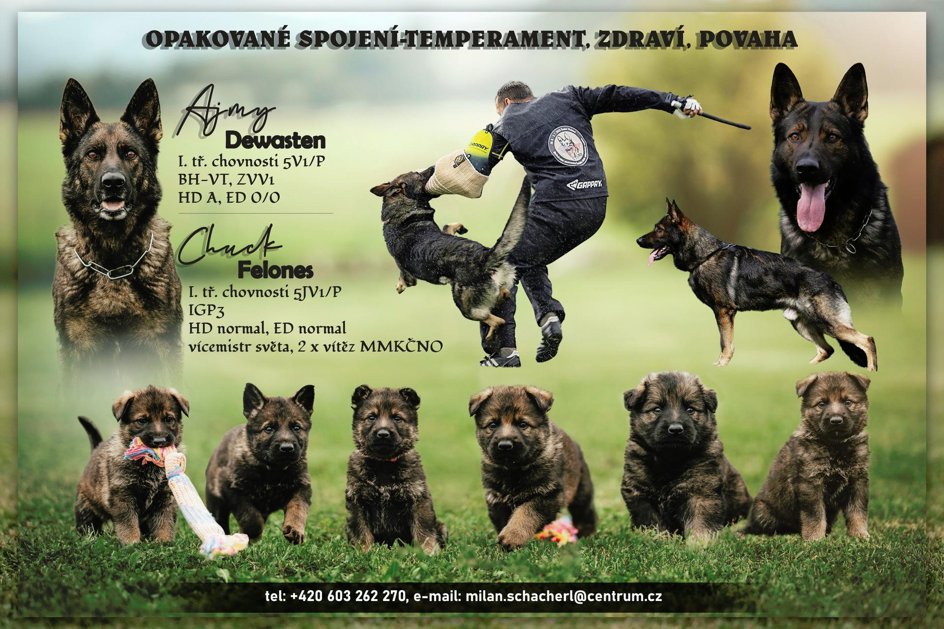 Zadám vlkošedá štěňata německých ovčáků, opakované spojení pro temperament-zdraví-povahu, otec vícemistr světa, dvojnásobný vítěz MMČKNO Chuck Felones, IGP3, velmi dobrý, I. třída chovnosti, 5JV1/P, matka Ajmy Dewasten, ZVV1, velmi dobrá, I. třída chovnosti, 5V1/P. Odběr konec listopadu, nezávazná návštěva vítána, štěňata budou v době odběru čipovaná, tetovaná, očkovaná.