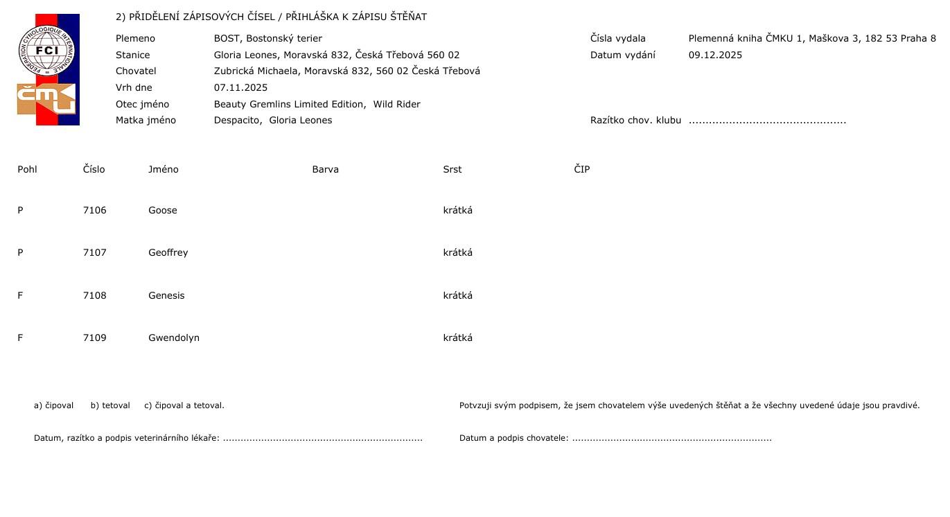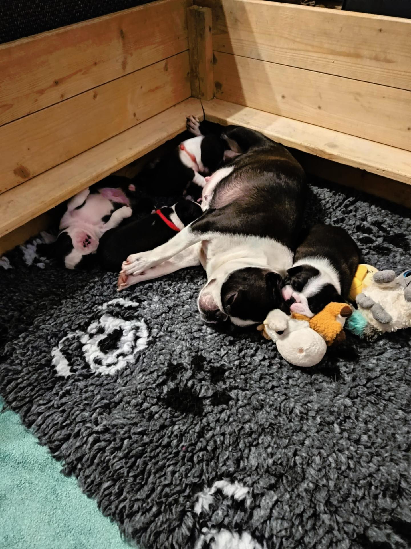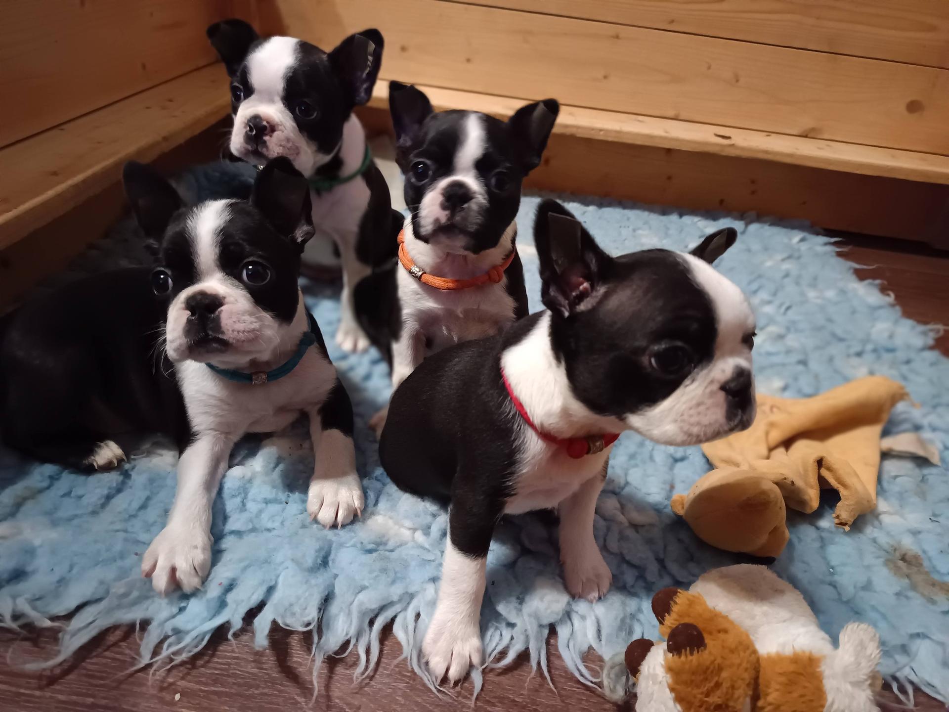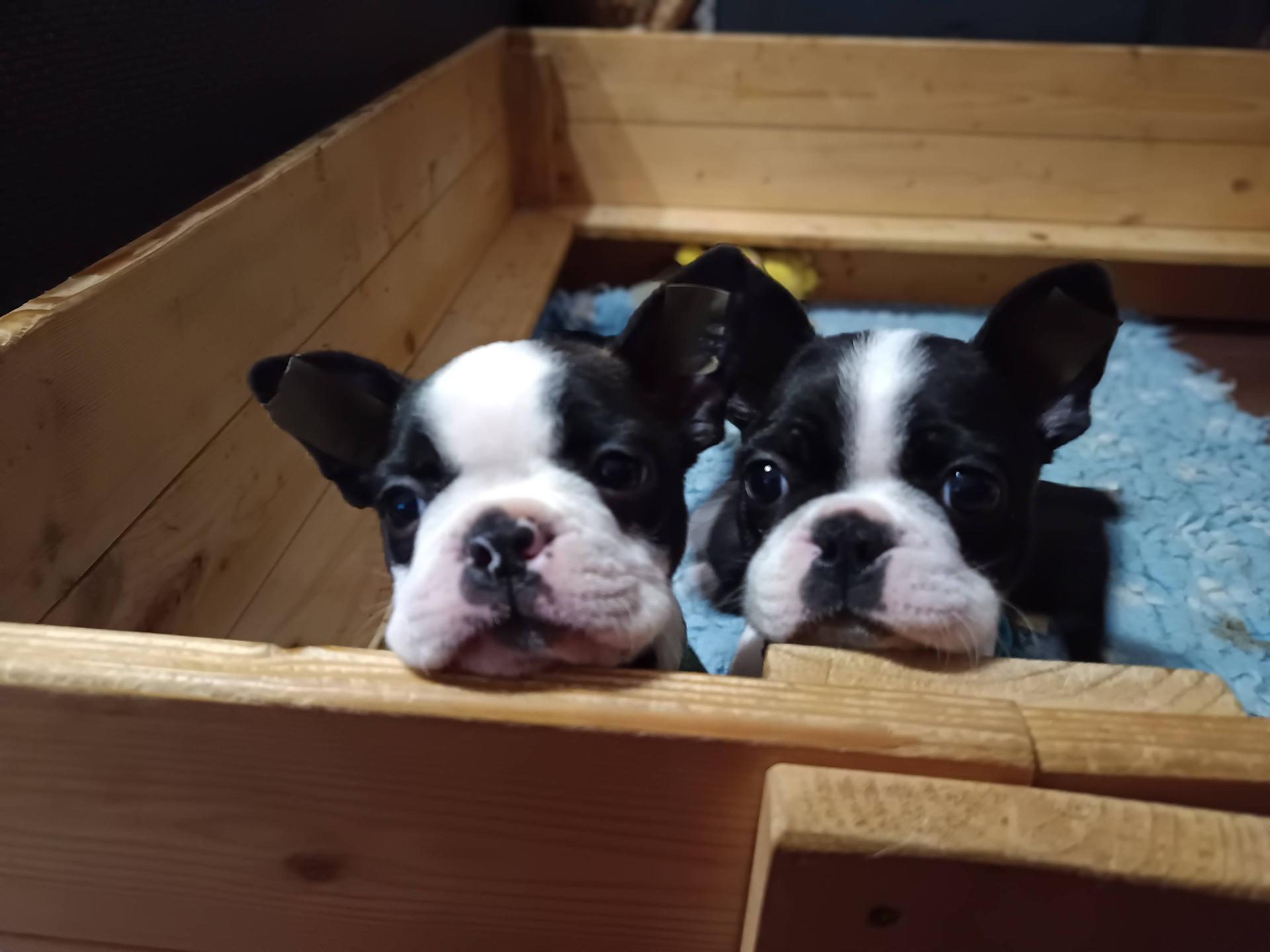 Naše CHS s dlouholetou tradicí nabízí k rezervaci štěňátka bostonského teriéra v barvě tmavě žíhaná s bílými znaky. Štěňátka jsou řádně očkovaná, čipovaná registrovanými čipy,s petpasportem a průkazem původu FCI !!! Štěňátka vyrůstají s námi, uprostřed naší rodiny, zvyklá na běžný ruch domácnosti, dětské ručičky, ostatní rodinné psy i venčení a dovádění venku ve sněhu. Více info telefonicky + na našem webu www.bostonterrier.wz.cz