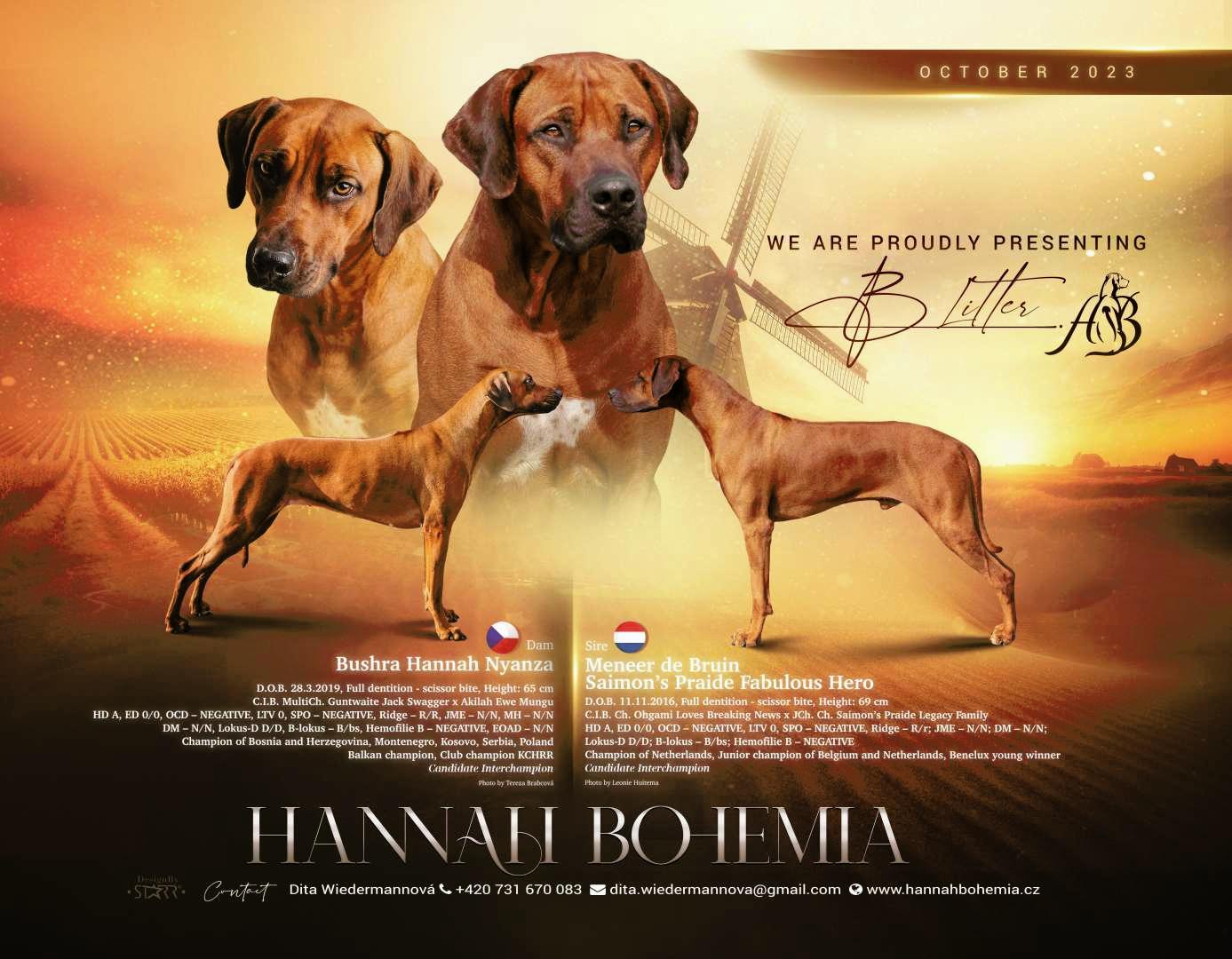 V chovatelské stanici Hannah-Bohemia se 28.10.2023 narodilo 11 krásných štěňátek, 5 holčiček a 6 chlapečků. 3 chlapečci mají hnědý nos. Jedná se o ojedinělé zahraniční spojení (pes nemá jiná štěňata v ČR). Oba rodiče jsou výstavně úspěšní, klidné vyrovnané povahy, poslušní, zdraví. Štěňátkům je věnována nadstandardní péče. Přijímáme rezervace na standardní holčičky a nestandardní chlapečky. Nestandardní chlapečci mají více korunek v ridgi. V době odběru budou očkovaná, čipovaná, odčervená, zdravá, s pet pasem. Doživotní chovatelský servis je samozřejmostí (výbavička do nové rodiny, možnost hlídání během dovolených, pravidelný kontakt s majiteli, možnost poskytnutí krmiva za zvýhodněných podmínek,...). K odběru budou od 23.12.2023. V případě zájmu nás neváhejte kontaktovat, nezávazné návštěvy jsou vítané.